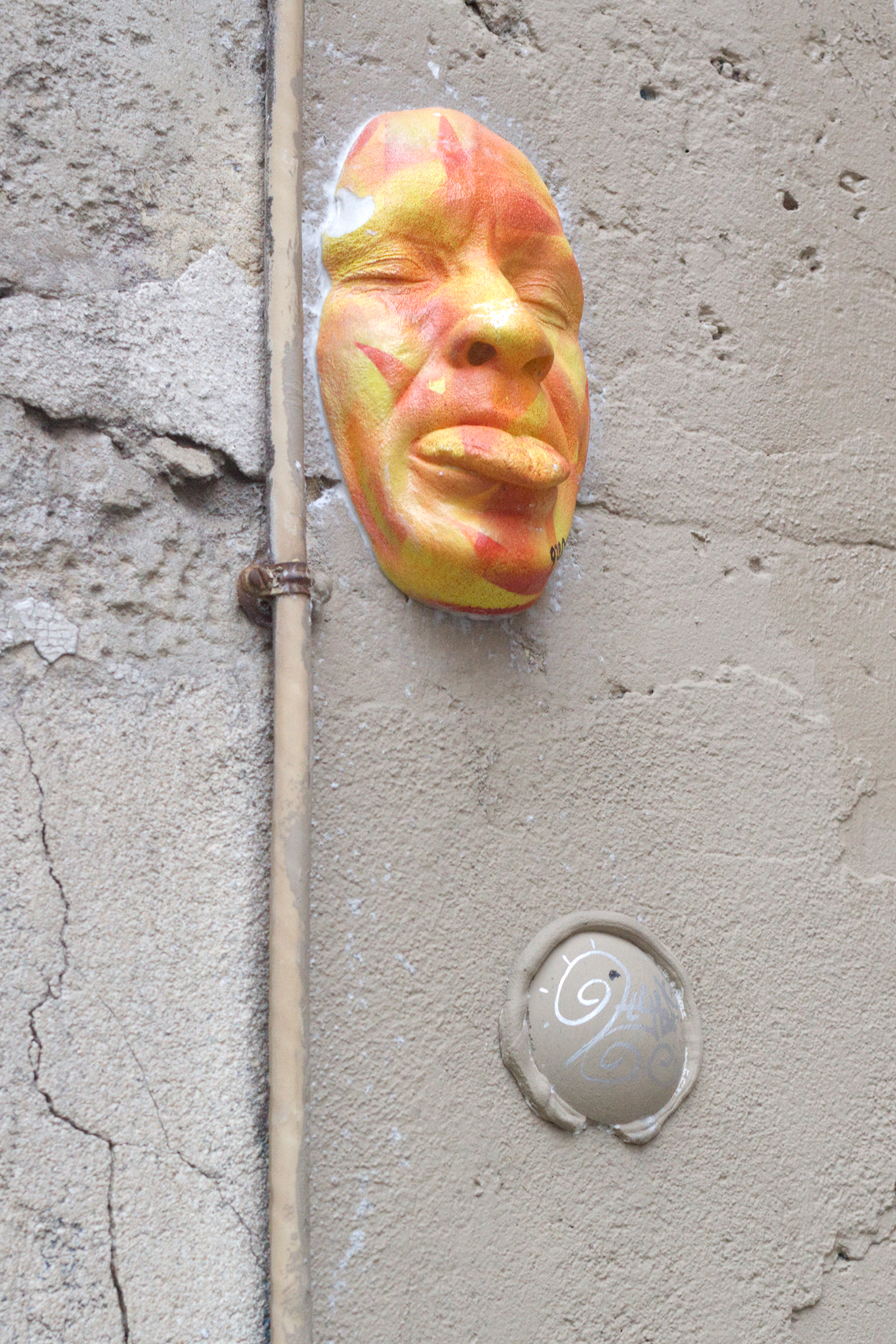 Et c’est ainsi que le premier moulage de Gregos est apparu sur le mur de l’école, son auto-portrait donc, celui qui tire la langue… comme pour dire « hého, moi aussi j’existe« .