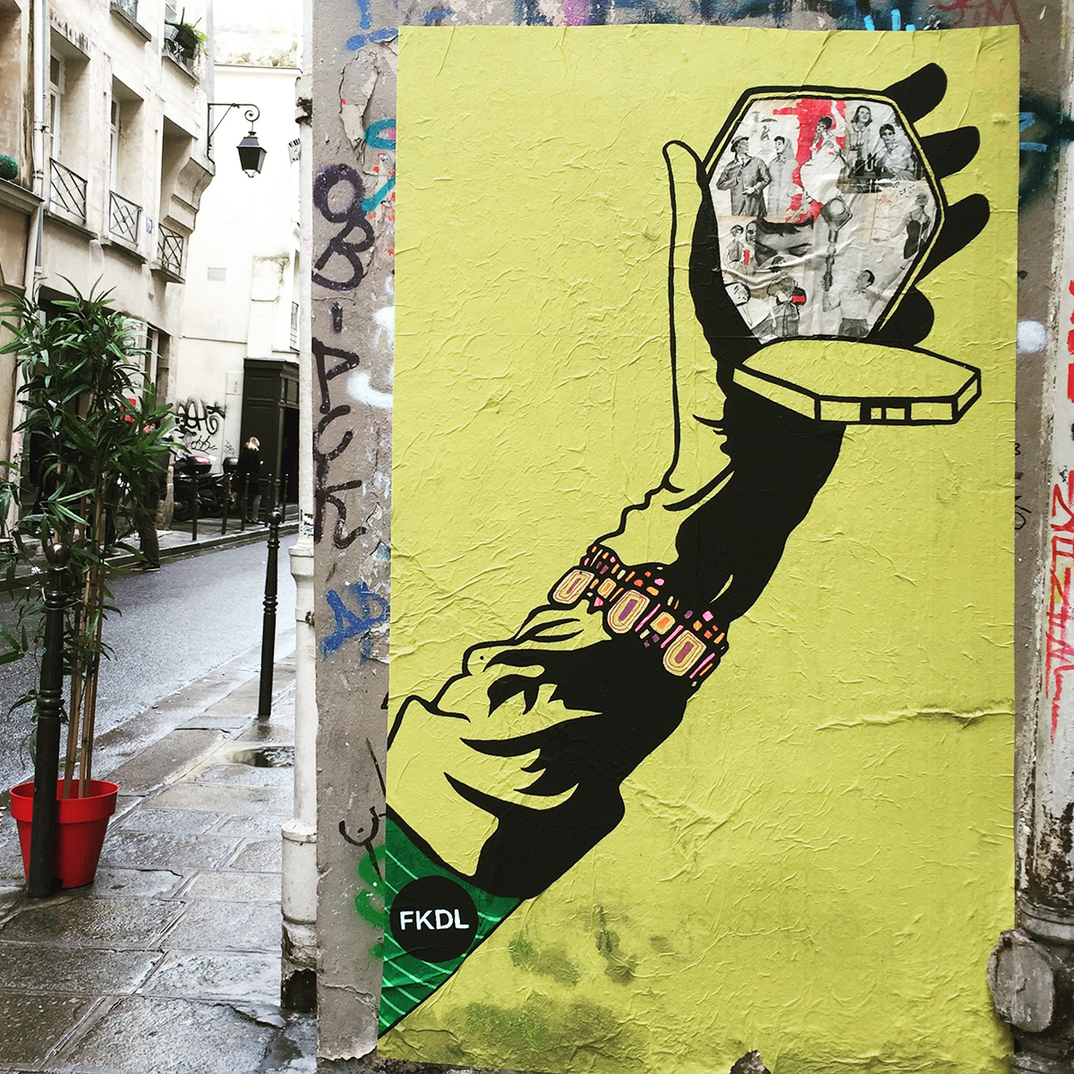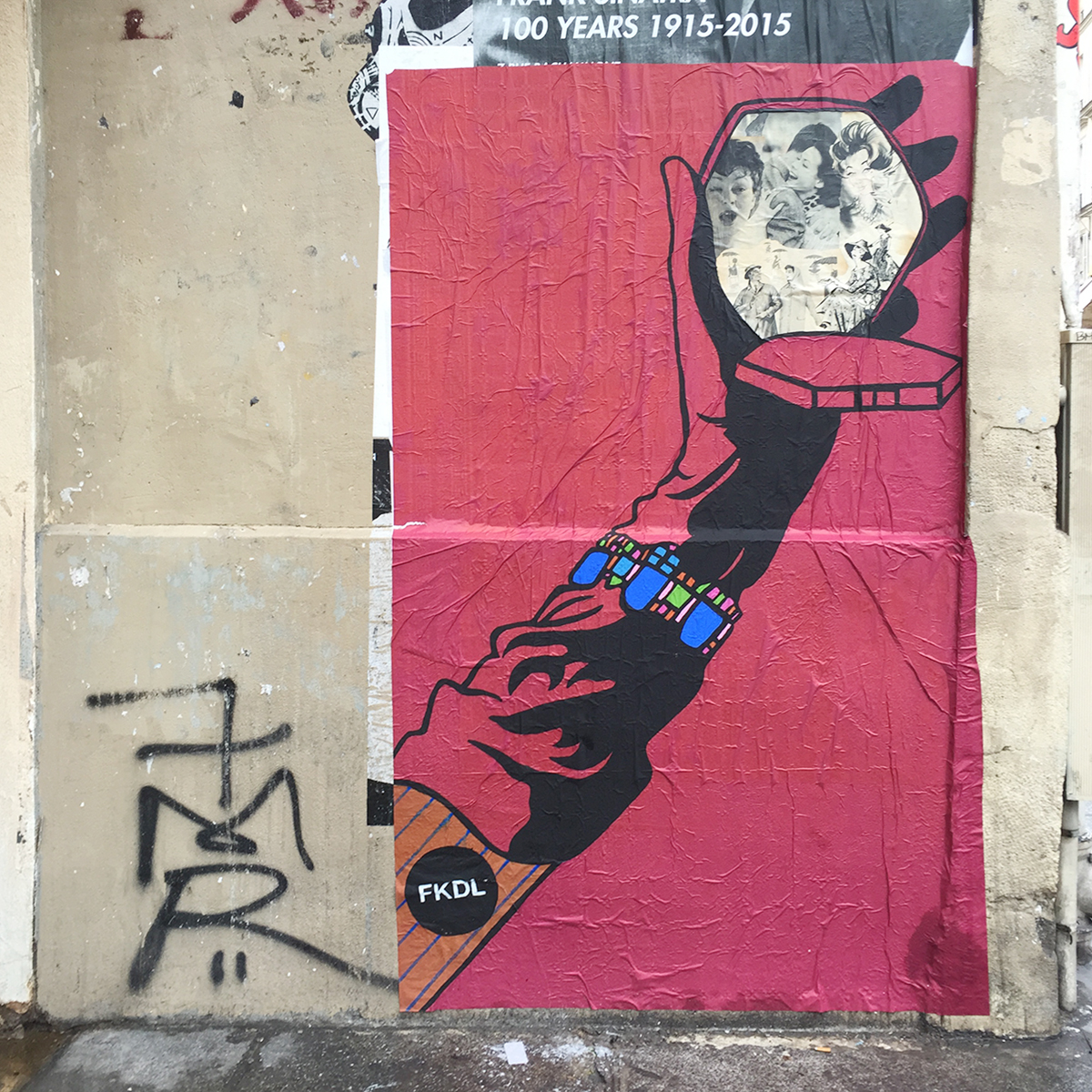 FKDL a rapidement pris goût à la rue, avec les rencontres que son travail suscite… il ne peux plus s’en passer et sort coller au moins une fois par semaine, dans les quartiers du Marais, mais aussi du 11ème, 10ème… Il colle ainsi quelques 30 personnages différents chaque mois !